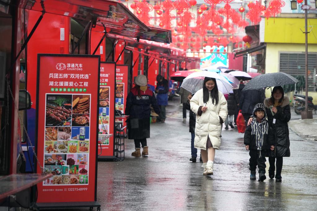 ??淅淅瀝瀝的冬雨沖洗著武漢東西湖區柏泉古鎮的街道,作為當地的春節習俗,茅廟集廟會2月1日至3日舉辦。除了傳統的武漢本地臘肉、炸肉圓等,今年廟會上最火爆的是來自新疆的年貨。