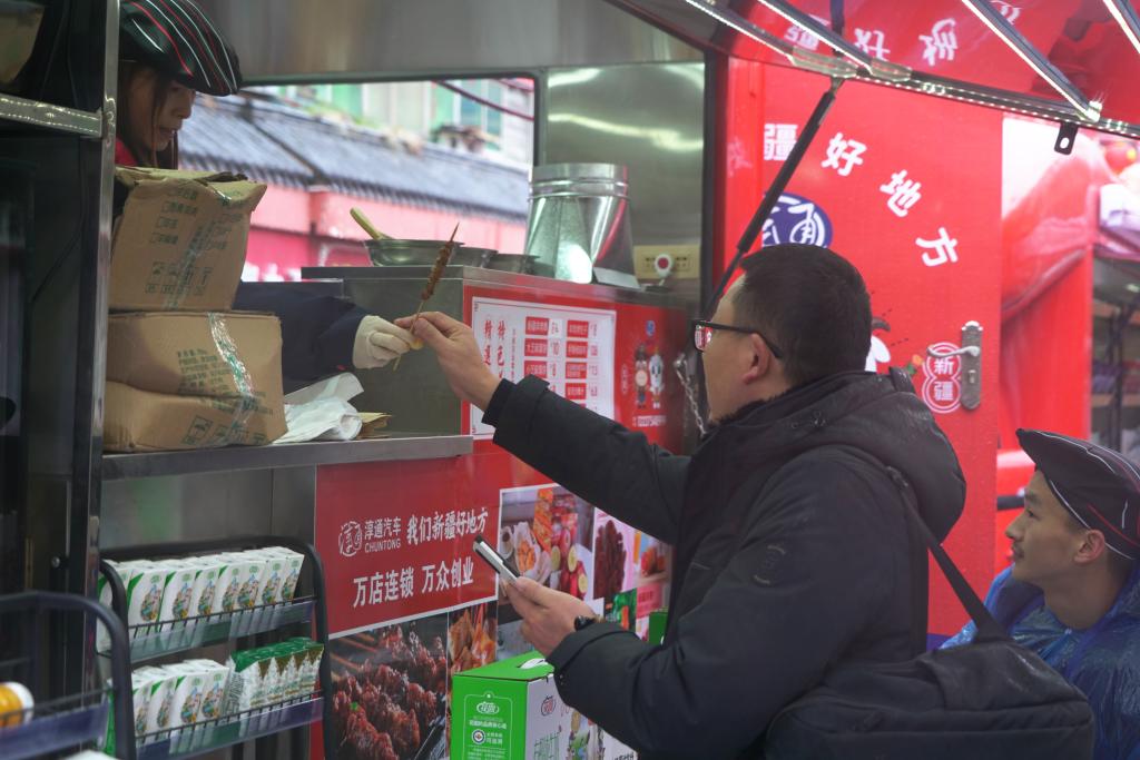??在新疆年貨區的最前端,10輛紅色的售貨車一字排開格外醒目,這些售貨車來自湖北企業淳通汽車?!翱靵韲L嘗新疆葡萄干。”“羊肉串美味不貴,歡迎品嘗?!贝就ㄆ嚳偨浝砗∑G在車前招攬著往來的顧客。她說,開著售貨車把新疆特產賣到全國各地,是企業正在做的援疆公益項目。