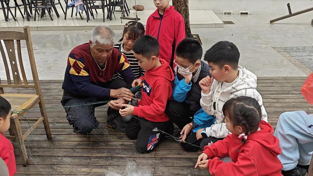 ??吳靜說,自己的父親是一位京族老漁民,天氣晴好時,他就在院子里教授客人們織造當地傳統的漁網,尤其受到小朋友們的歡迎。