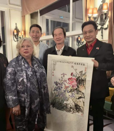 著名畫家唐新江向電影節組委會贈送了國畫《富貴平安圖》,作品以中法兩國國花牡丹、鳶尾花為主,寓意中法友誼如花常艷,東西方文明相親相融。