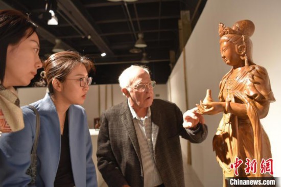 當地時間8月12日,巴西圣保羅州坎皮納斯市,“中國藝術五千年 塞奎拉·萊特收藏”啟幕。圖為巴西文物修復師毛羅·里貝羅(右一)講解如何修復木雕觀音像。中新社記者 林春茵 攝