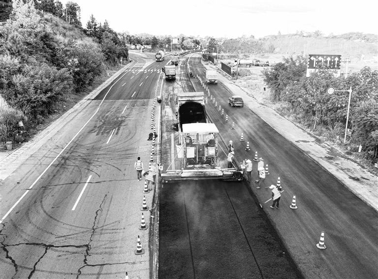 8月13日,在G320國道橫峰縣司鋪鄉段路面功能性改造工程施工現場,橫峰公路中心養護工人頭頂烈日,配合攤鋪機對路面的瀝青混合料進行攤鋪平整。侯先鋼 攝