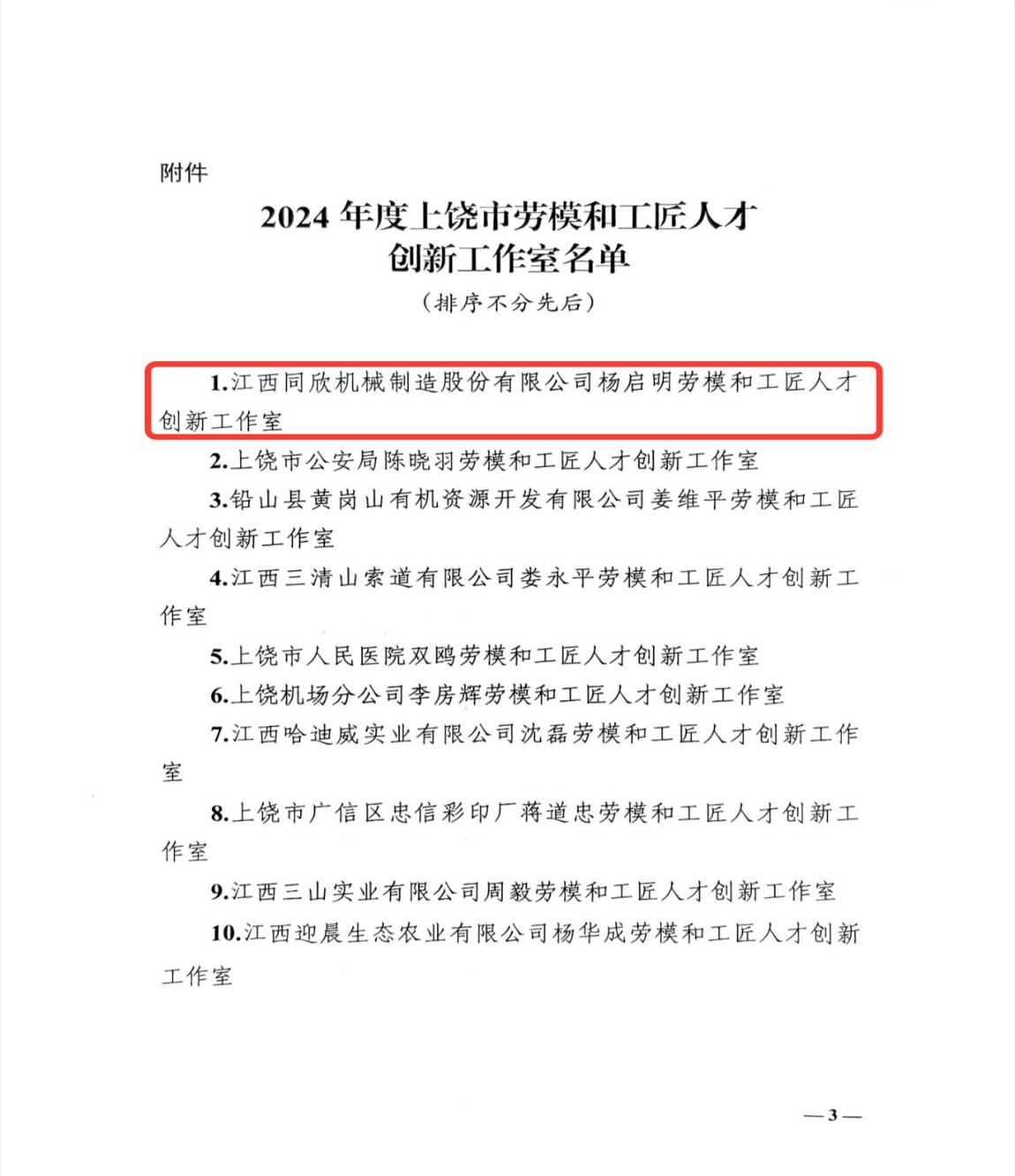 近日,廣豐區江西同欣機械制造有限公司“楊啟明勞模和工匠人才創新工作室”被市總工會命名為2024年度上饒市勞模和工匠人才創新工作室。