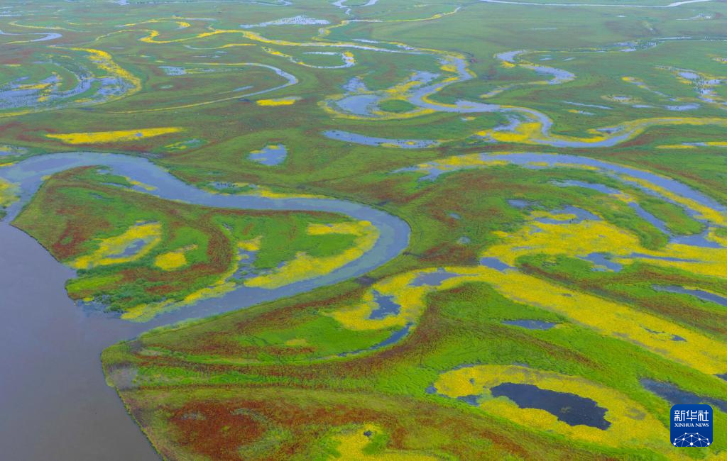 近日,黑龍江撓力河國家級自然保護區濕地中的驢蹄草盛開花朵,濕地仿佛披上了黃綠相間、色彩明艷的綢緞。